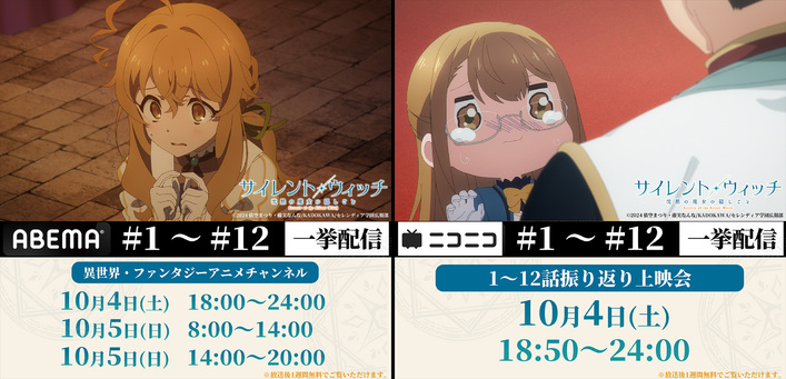 ABEMAおよびニコニコ生放送にて「サイレント・ウィッチ 沈黙の魔女の隠しごと」の一挙配信を実施いたします。
